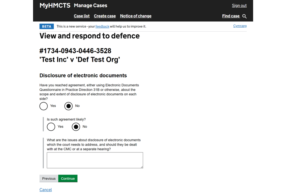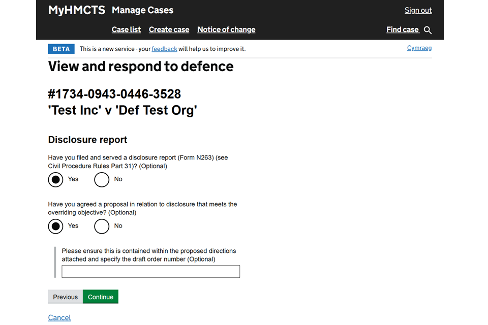10. Select whether you have filed and served a disclosure report and if you have agreed a disclosure proposal. Add a draft order number if relevant. Then select ‘Continue’.