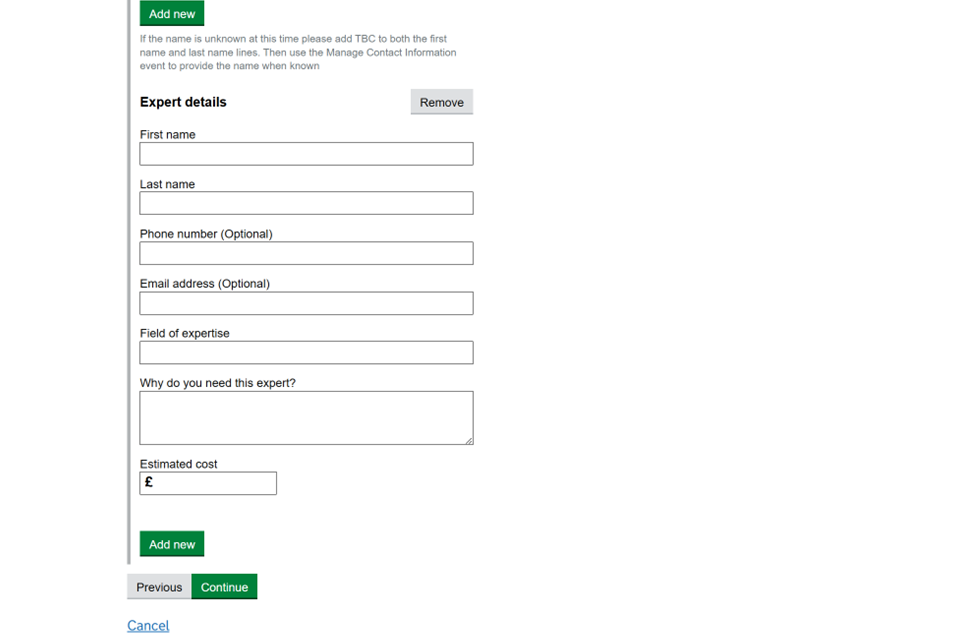 11. If you want to use an expert in your case, select if you have already sent them reports and if you think they are suitable as a joint expert. Select ‘Add new’ to enter the expert’s details. Then select ‘Continue’.
