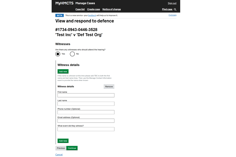 12. If you want to bring a witness to a hearing, select ‘Add new’ to enter their details. When you have added all the witnesses’ details, select ‘Continue’.