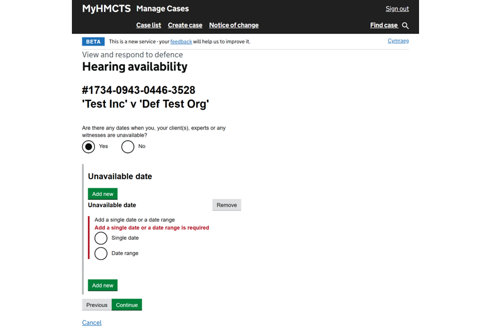 14. If your client, experts or witnesses have any dates to avoid, select ‘Yes’ then ‘Add new’ and provide the details. When you have added all dates, select ‘Continue’.