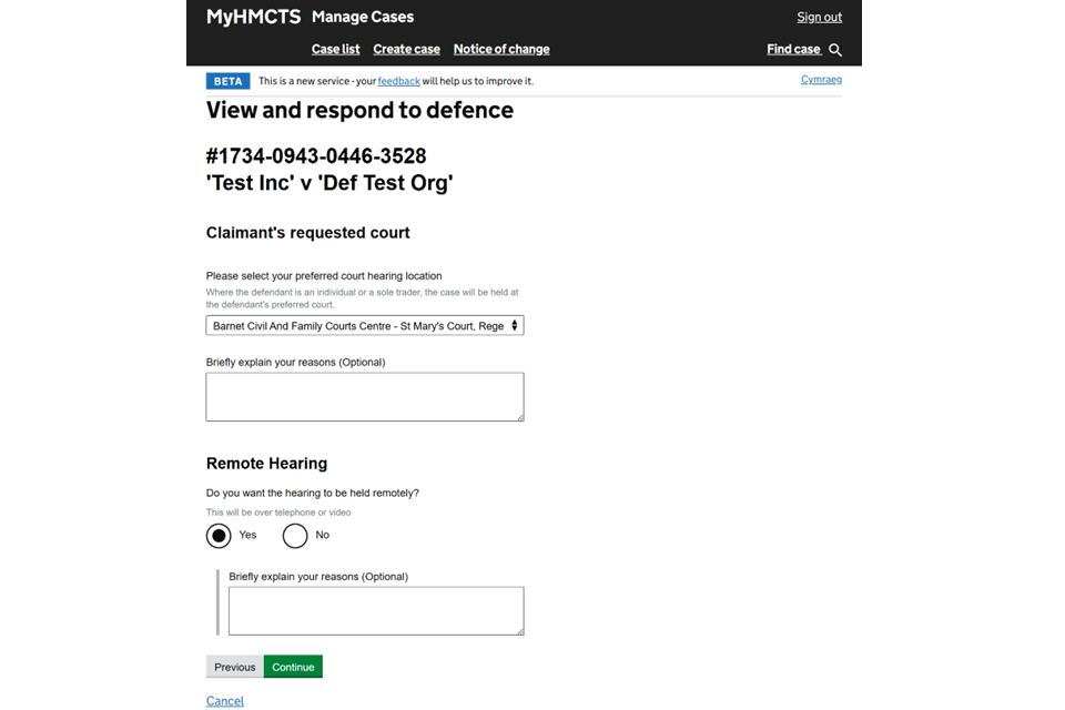 15. Select the preferred court hearing location and add the reasons for the preference. If you want the hearing to be held remotely, explain why. Then select ‘Continue’.