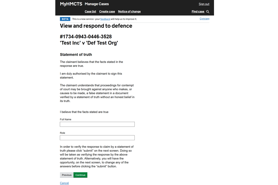 19. Read the statement of truth and add your name and role. Then select ‘Continue’.