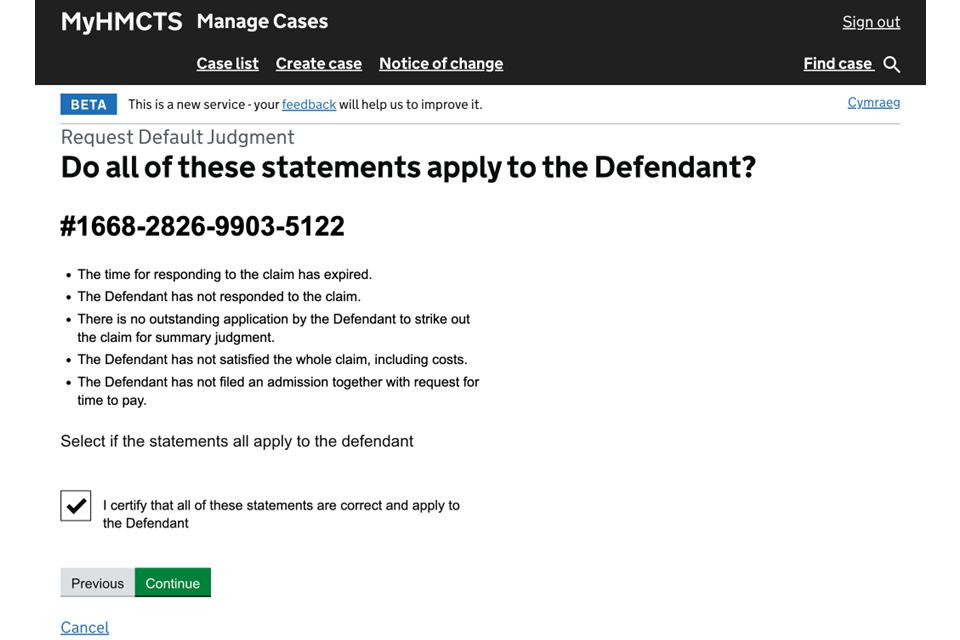4. Tick the box to confirm that all the listed statements apply to the defendant. Then select ‘Continue’.