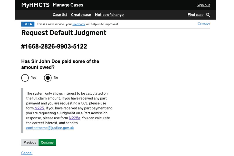 5. Select ‘No’ to say the defendant has not paid some of the amount. Then select ‘Continue’.