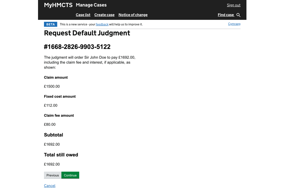 7. You will see a summary of the money owed, including the claim amount, any fixed cost, the claim fee and the total amount owed. Select ‘Continue’.