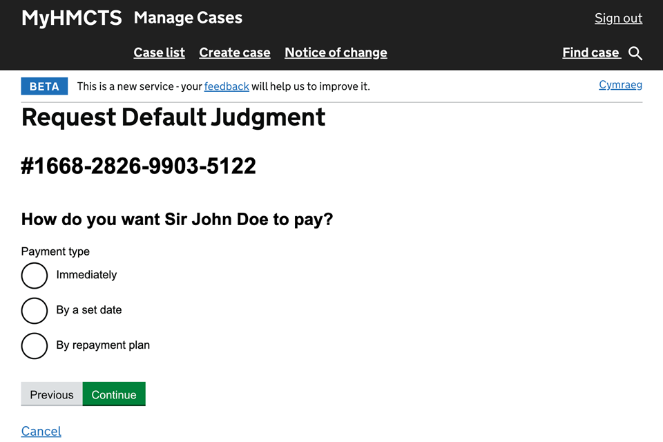 8. Select if you want the defendant to pay immediately, by a set date or by a repayment plan. Then select ‘Continue’.