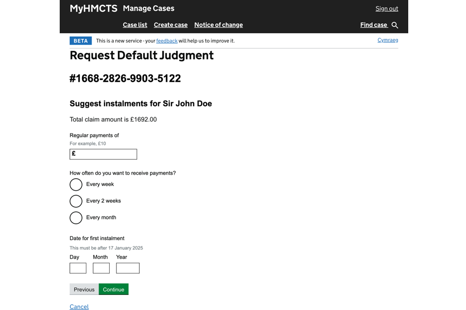 10. If you have selected by a repayment plan, enter what you think the value of the regular payments should be. Then select how often you want the defendant to pay. Add the date the first instalment should be paid. Then select ‘Continue’.