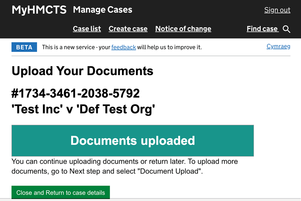 6. You will see a confirmation that your documents have been uploaded. Select ‘Close and Return to case details’ to find the documents in the ‘Case File’ tab.