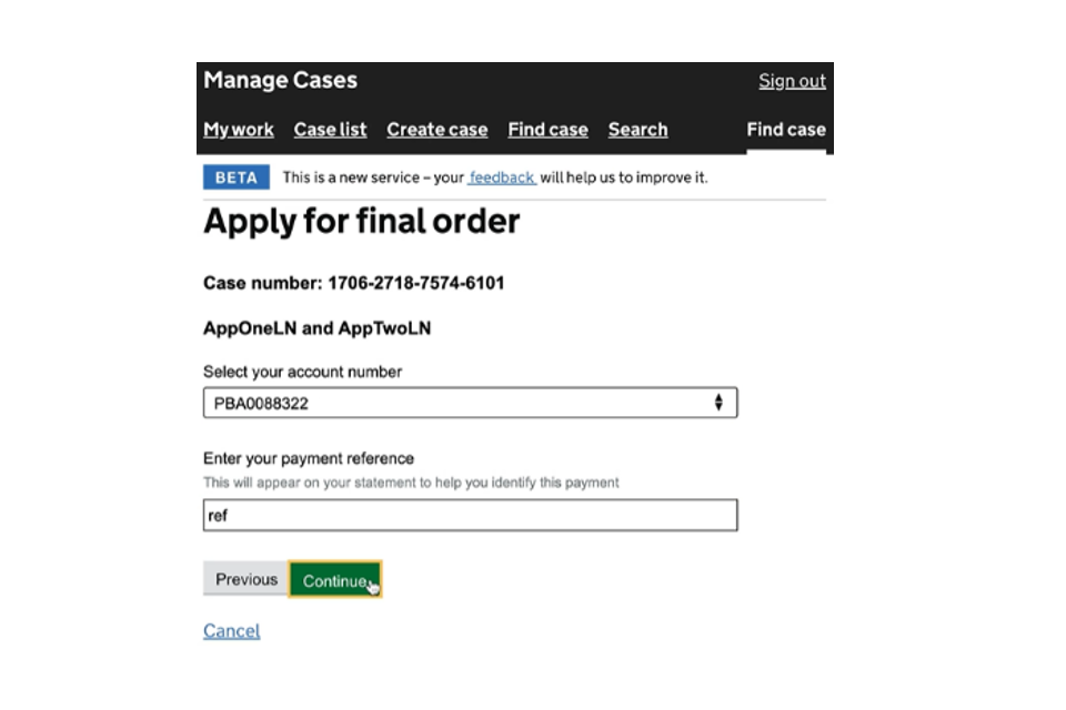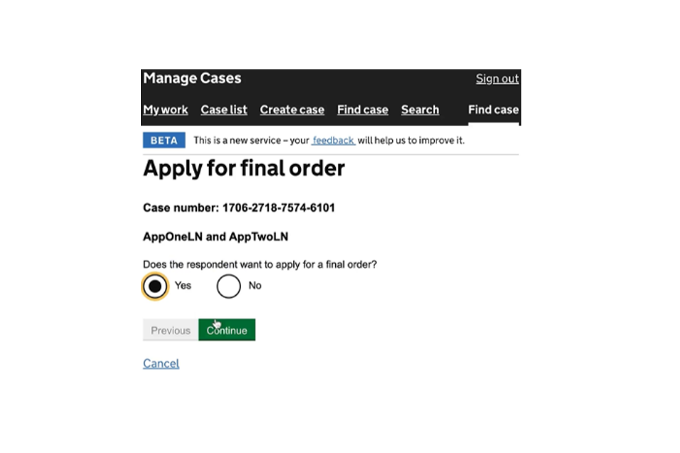 Once you have been notified to say you can apply for a final order, either follow the link in the email notification, or log in to MyHMCTS to find a case.