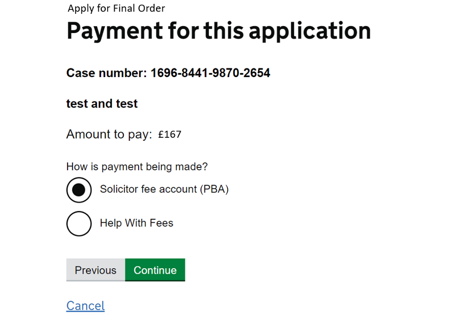 What you see on the next screen will depend on whether the fee is being paid through Payment by Account (PBA) or help with fees.