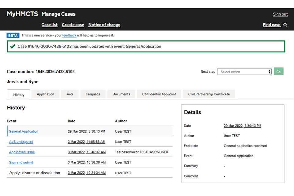 5. A banner tick box appears at the top of the page to say the case ‘has been updated with the event: General application’.