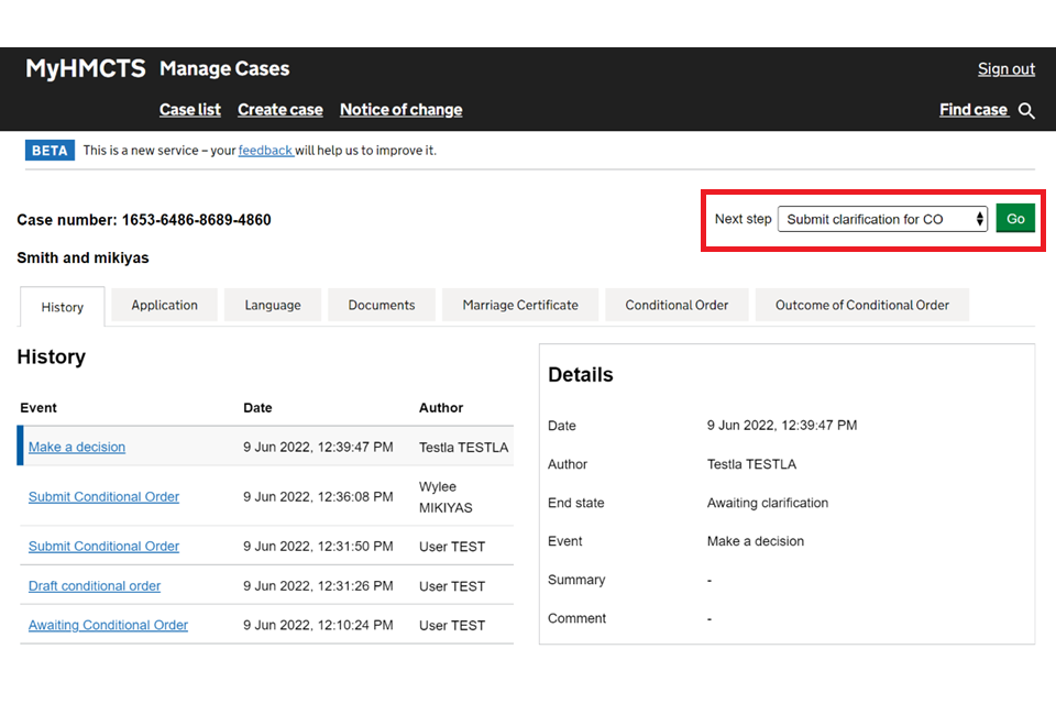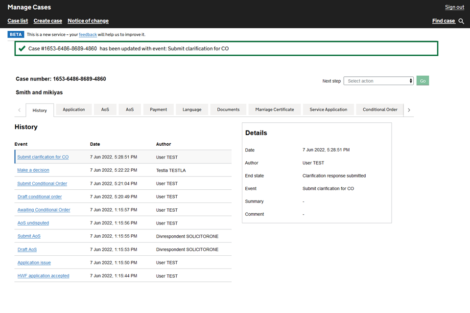 10. You will see a green box at the top of the ‘History’ tab, with the case number and confirmation it has been updated with the event: Submit clarification for CO. You will also see ‘Submit clarification for CO’ in the list of events and in the ‘Details’ box that the End state is ‘Clarification response submitted’.