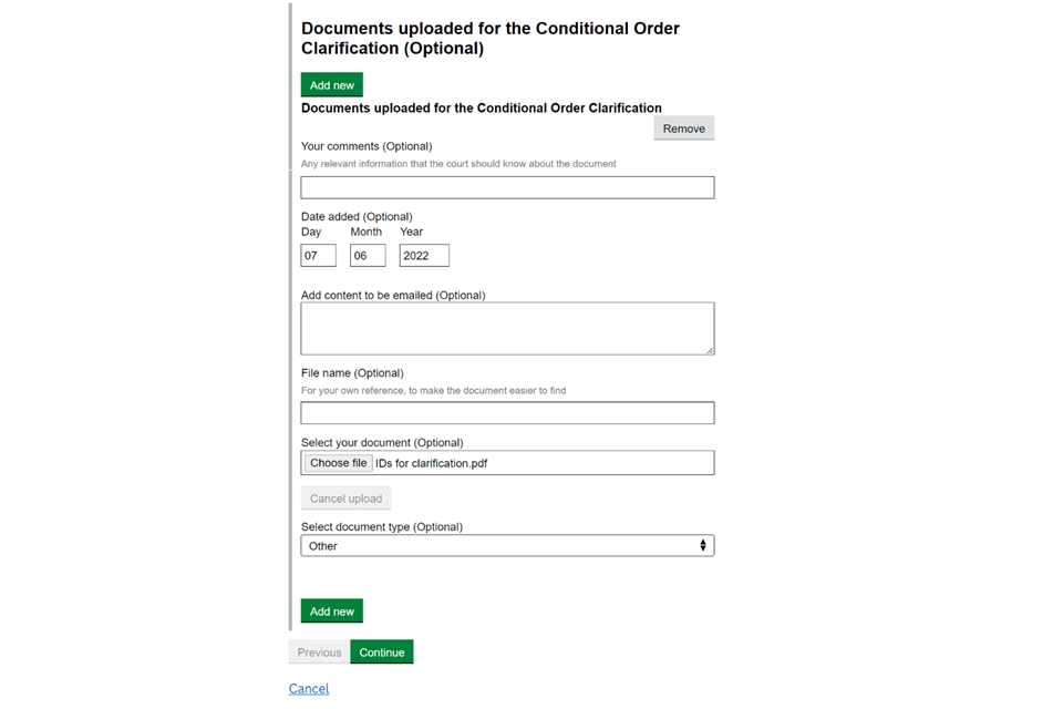 5. If you need to add supporting documents, select ‘Add new’ under ‘Documents uploaded for the Conditional Order Clarification (Optional)’.