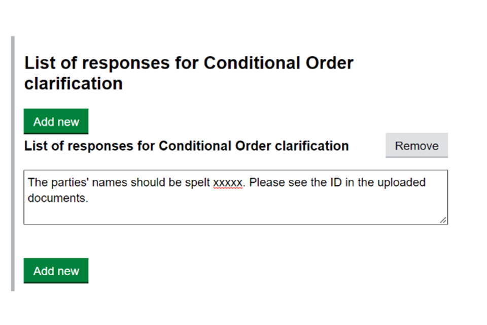 4. Under ‘List of responses for Conditional Order clarification’ select ‘Add new’ and write your clarification to the first reason given for the refusal. If there was more than one given, select ‘Add new’ again and write your next clarification. Add a clarification for each reason given.