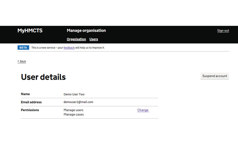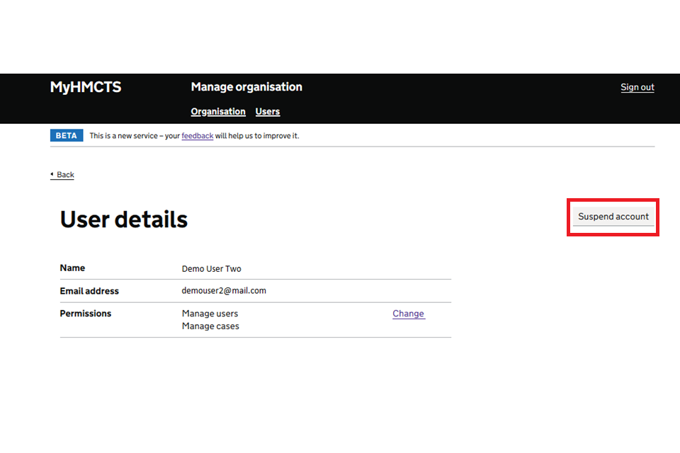 Suspending an account removes the user’s access immediately and they will not be able to login to MyHMCTS.