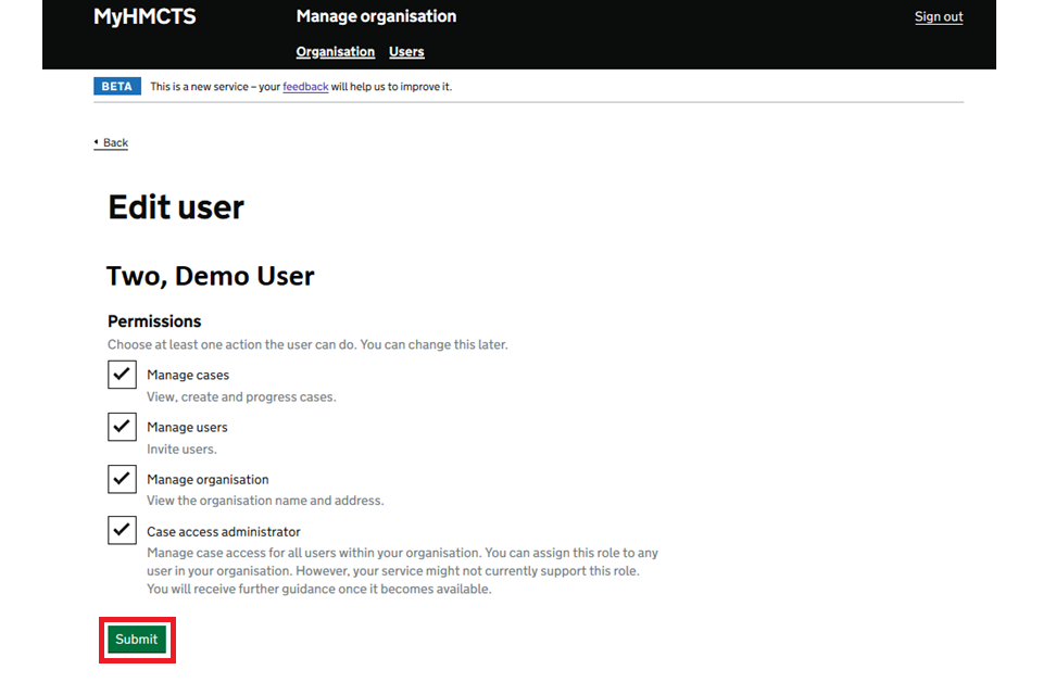 2. Follow the steps to edit a user, then on the ‘Edit user screen’ make sure all boxes are checked. Then select ‘Submit’.