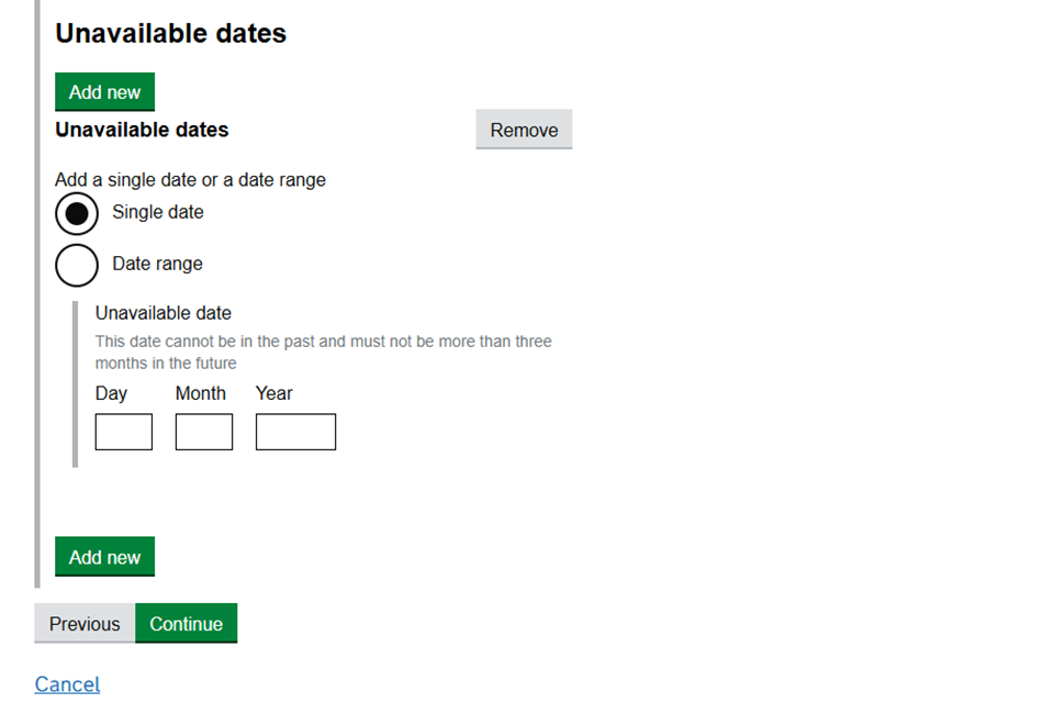 12. Select if there are any dates in the next 3 months that you or the defendant cannot attend. If ‘Yes’, select ‘Add new’. Select whether it is a single date or date range and enter the date or dates. If you need to add another date or date range, select ‘Add new’ and repeat the steps. When you have added all the dates, select ‘Continue’.
