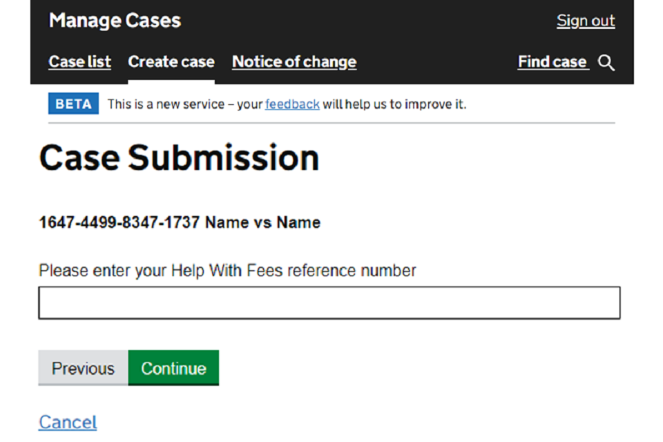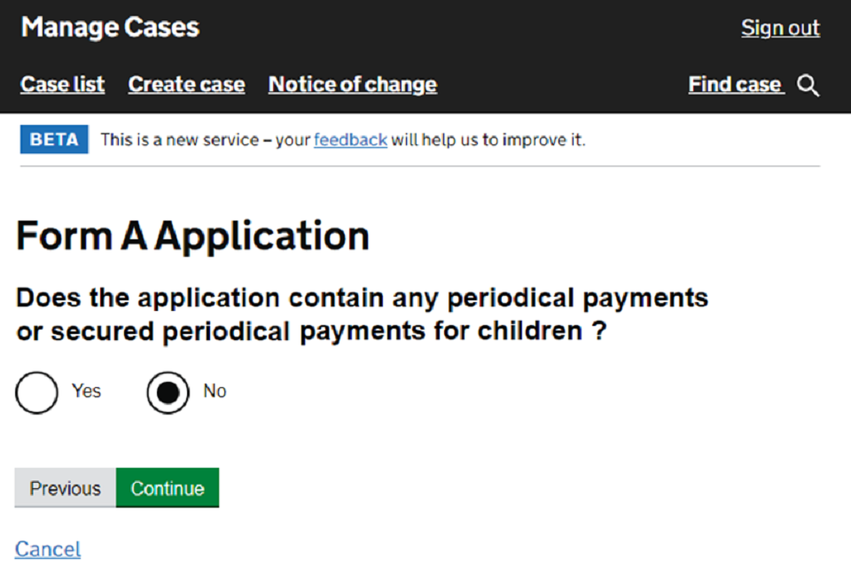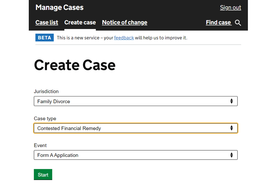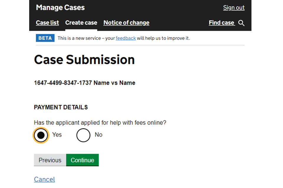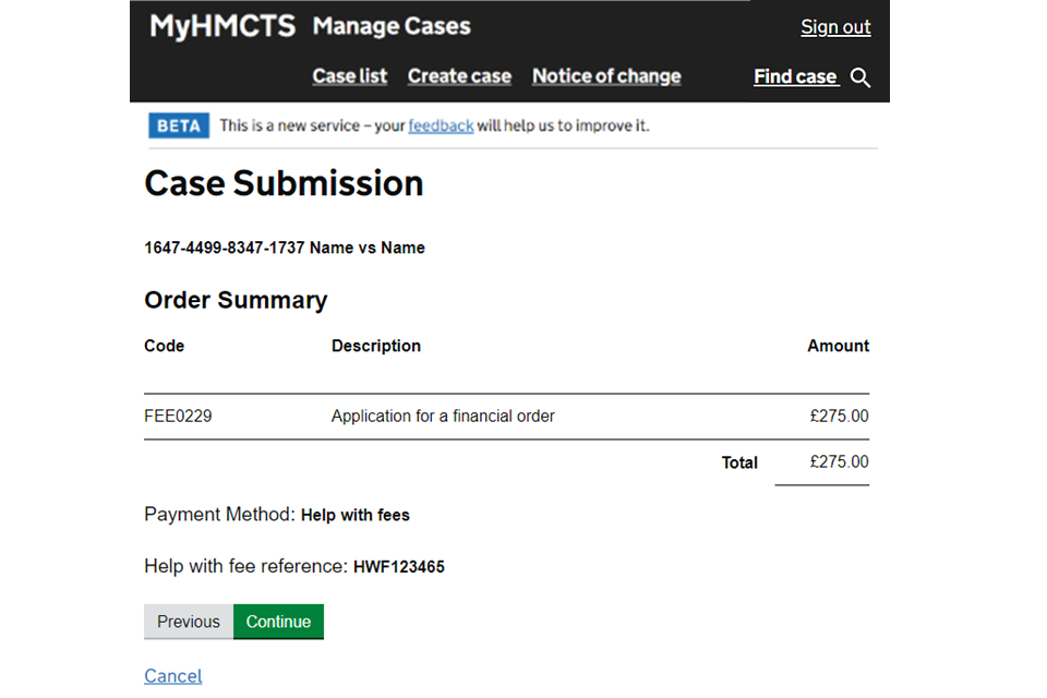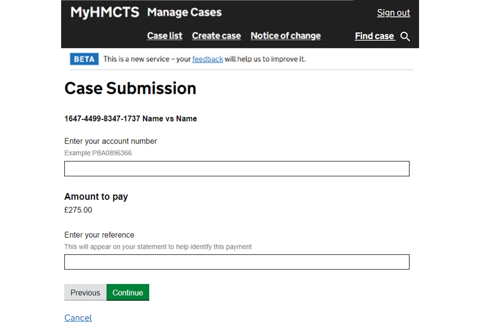 If you’re a solicitor who is not based in the UK and you do not have a PBA account, do not select ‘Case submission’. Instead, you must contact hmctsfinancialremedy@justice.gov.uk to arrange payment.