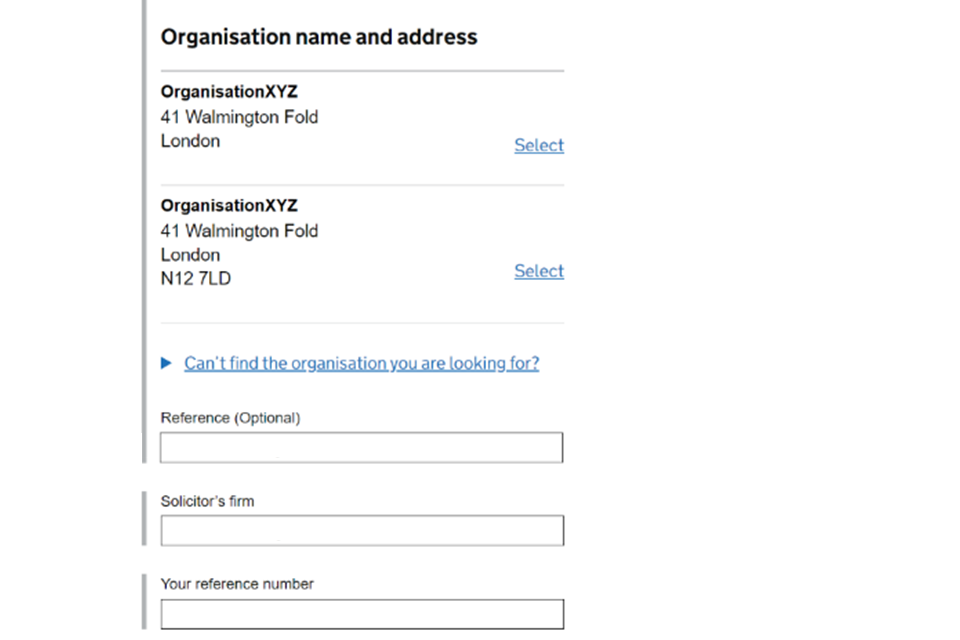 4. Once you have found the correct address for your organisation, choose ‘Select’. If you do not select your organisation, you will not be able to access the case once you have submitted the application.
