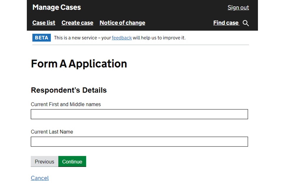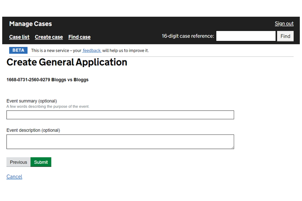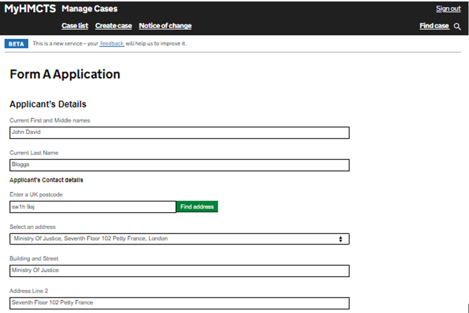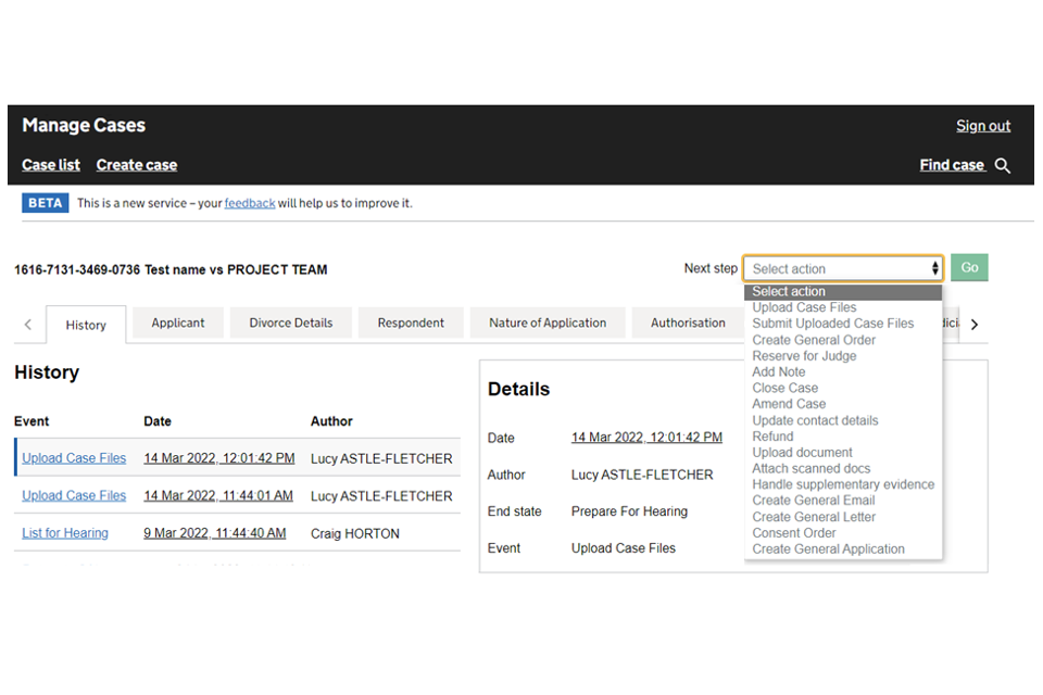 4. Search for cases, use the ‘Find case’ link at the top right of the screen. Search using the divorce case number, party names or the solicitor reference.
