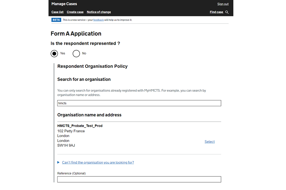 3. If the search box fails to find your organisation or shows an error, you should contact MyHMCTSSupport@justice.gov.uk for help.