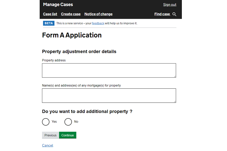5. If you select ‘Property adjustment order’ for example, you will need to provide details of properties and mortgages.