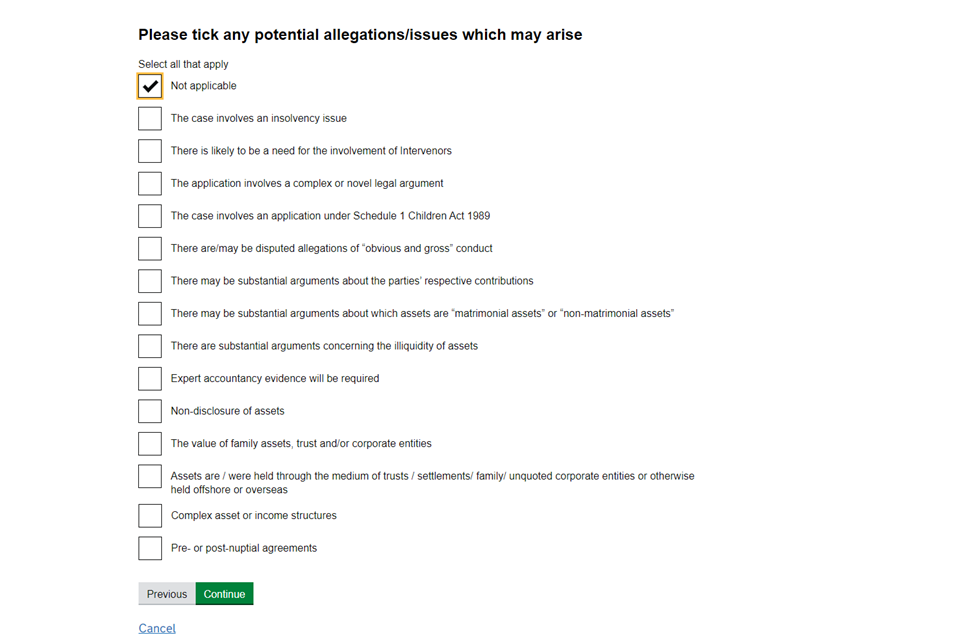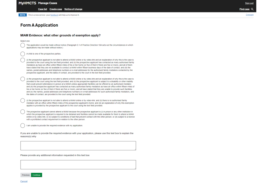 9. If you selected the ‘other’ option for why the applicant has not attended a MIAM, you’ll be asked what other grounds apply. Select one option or, if none apply, use the free text box to add the reason. Then select ‘Continue’.
