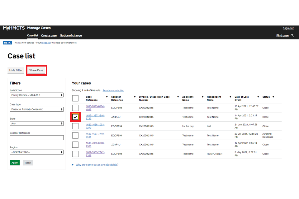 Once your application is submitted you can share it with others in your organisation. They can update the case and respond to orders on your behalf. Cases that are ineligible for sharing have their checkboxes faded out.