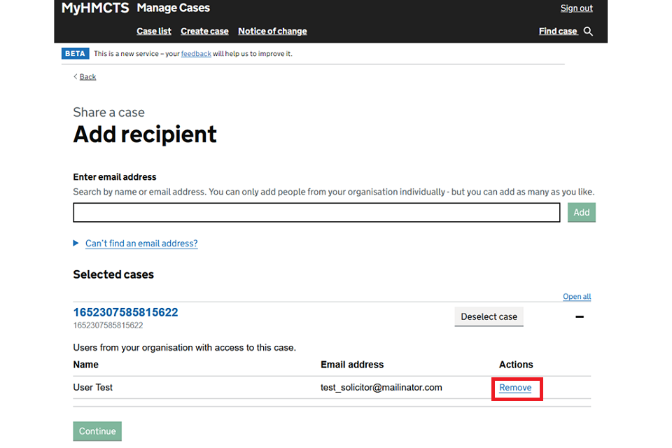 8. When you have finished adding the users you want to share the case with, select ‘Continue’.