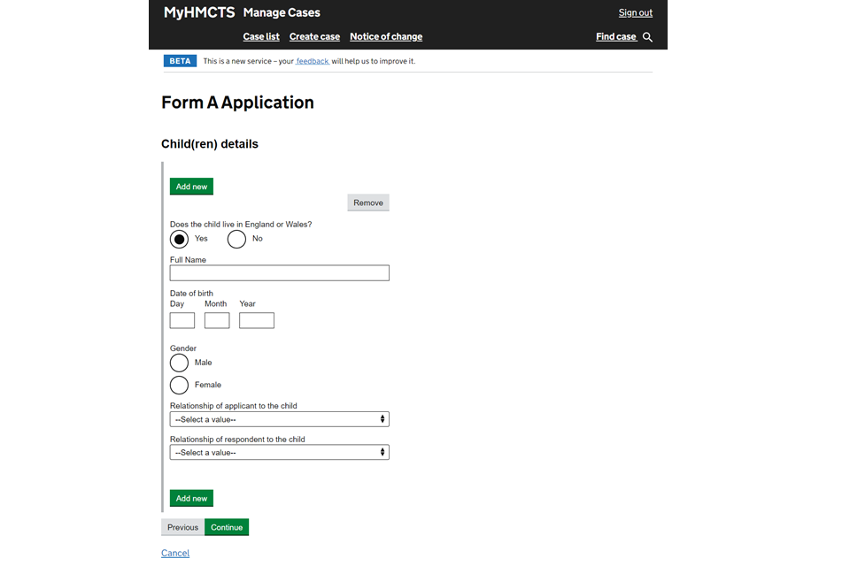 4. On the child’s details page, select ‘Add new’ then add the child’s information. When you’ve added all the information, select ‘Continue’.