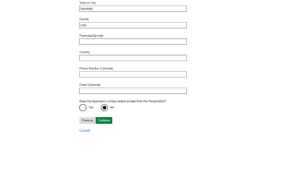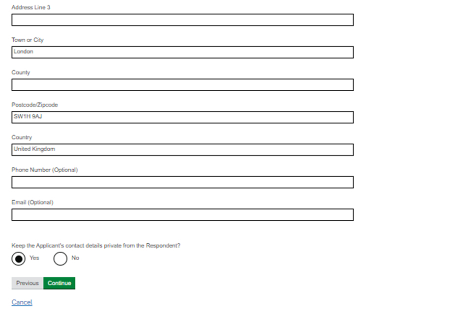 If the applicant’s contact details are confidential, you must select ‘Yes’ to the question ‘Keep the applicant’s contact details private from the respondent?’. These details will then just appear in a ‘Confidential applicant’ tab, which only you and the court can view.