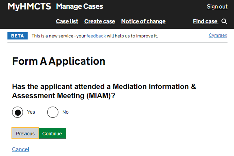 1. Select if the applicant has attended a MIAM, then select ‘Continue’.