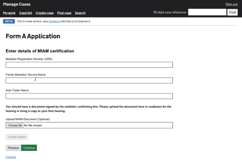 2. If you have selected ‘Yes’, enter the details of the MIAM certification and upload a copy. Then select ‘Continue’. You will now move to uploading other documents.