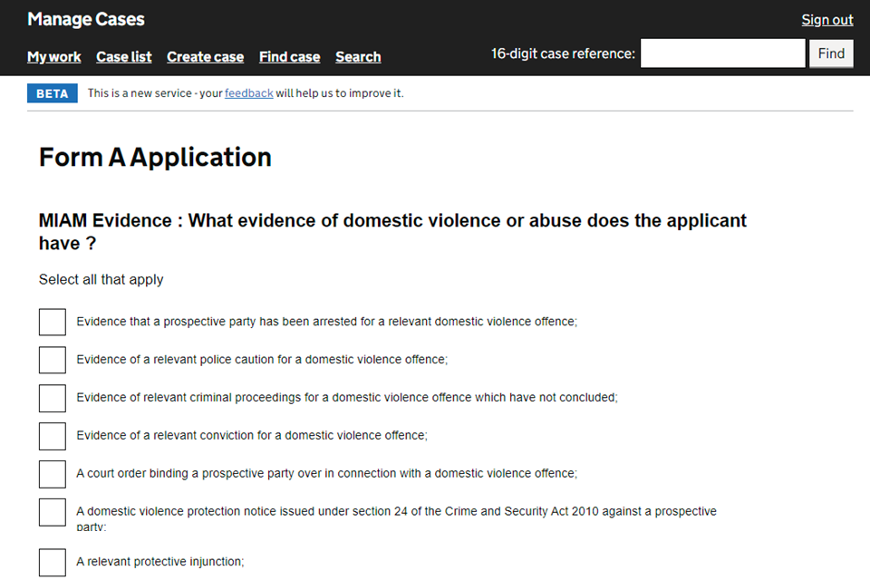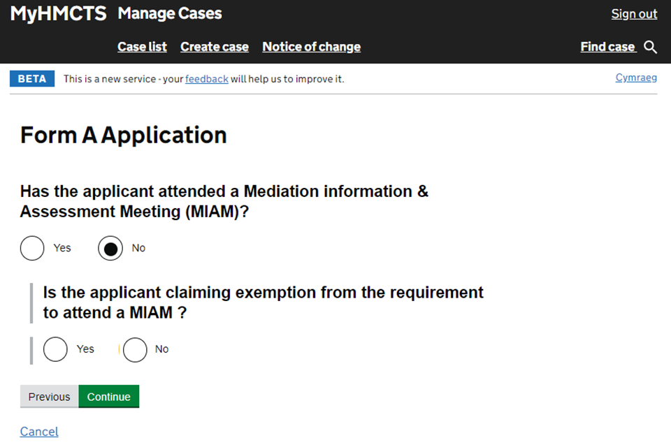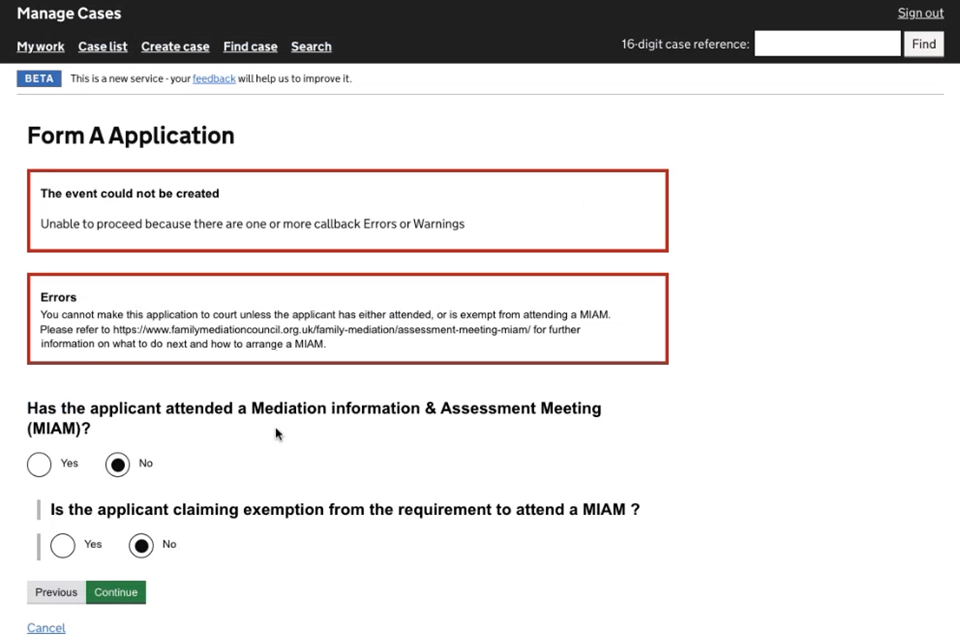 4. If you select ‘No’ to this, you will see an error message and will not be able to continue, as either a MIAM or an exemption is required.