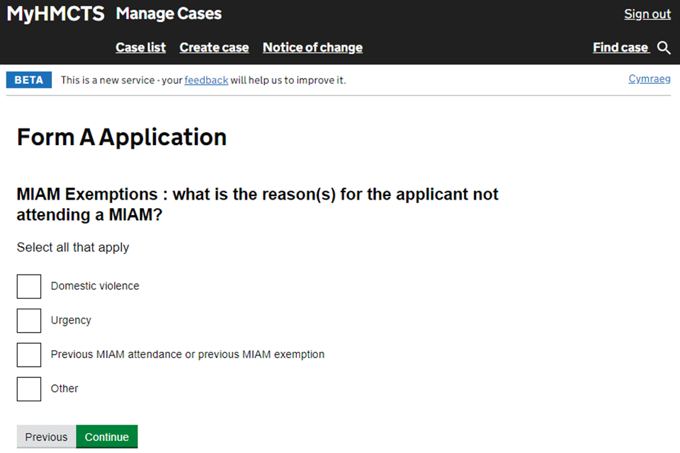 5. If you have selected ‘Yes’ to the exemption, you will be asked the reason why the applicant has not attended a MIAM. Select one of the options and then ‘Continue’.