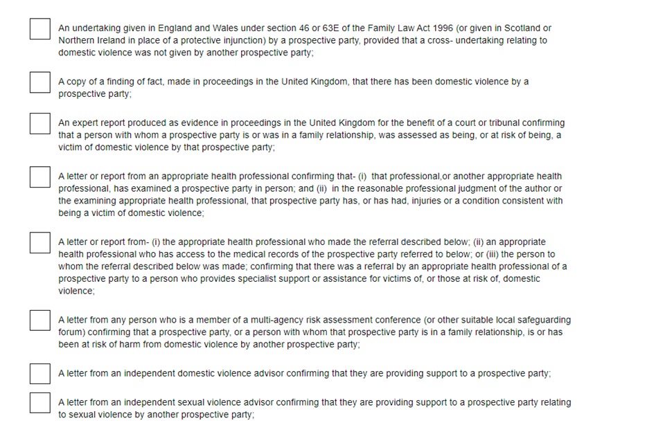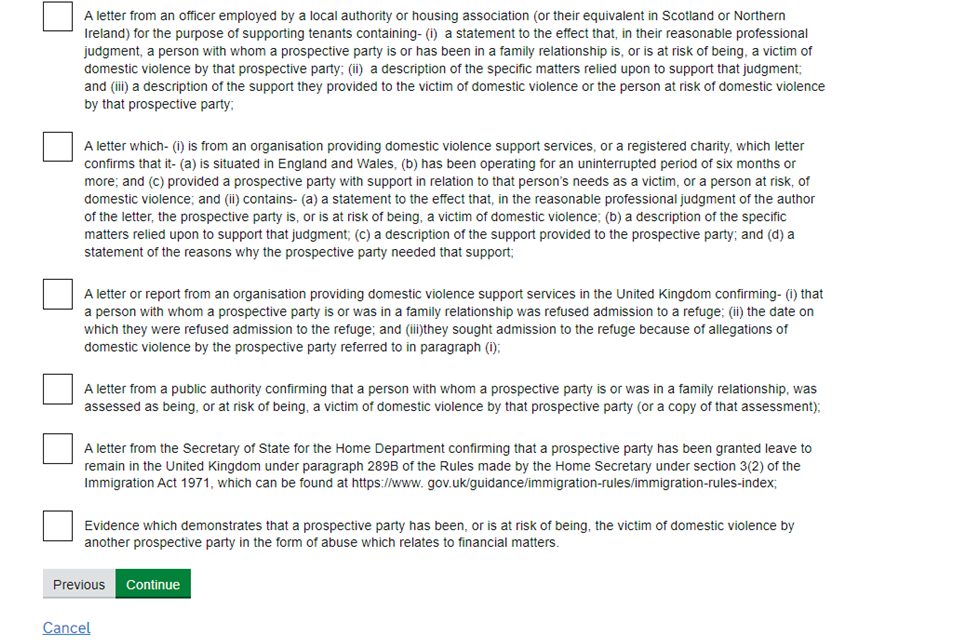 6. If you have selected ‘domestic abuse’ as the reason, you will then be asked what evidence of abuse the applicant has. Select all that apply, then ‘Continue’.