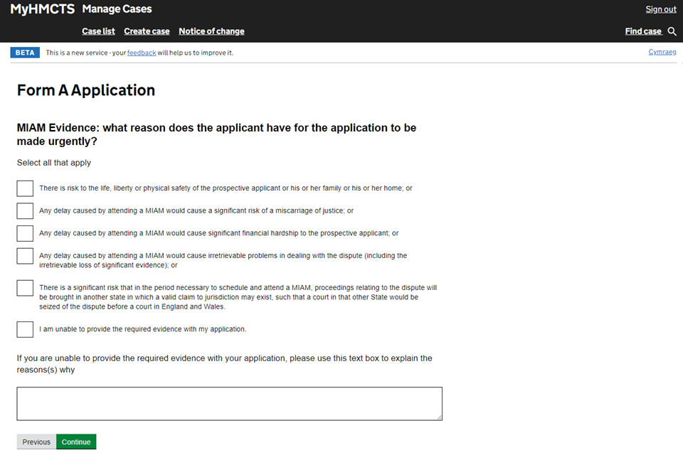 7. If you have selected ‘urgency’ as the reason for the applicant not attending the MIAM, you’ll be asked why the application is urgent. Select all that apply, then ‘Continue’.