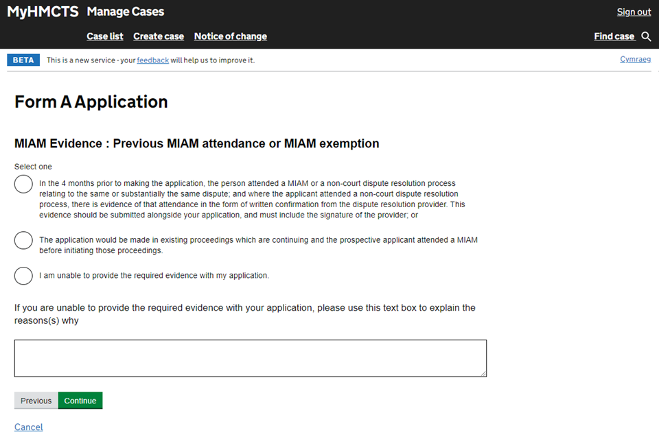 8. If you have selected ‘previous MIAM attendance or MIAM exemption’ as the reason, you’ll be asked what evidence the applicant has. Select one option, then ‘Continue’.