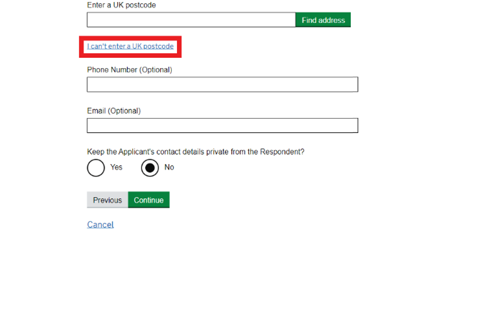 If the applicant lives outside the UK, select ‘Yes’ to the question ‘Does the applicant live outside of the UK?’. Then select ‘I can’t enter a UK postcode’.