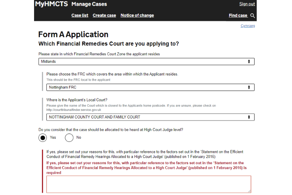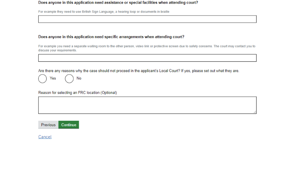 1. You must make your application to the financial remedy court (FRC) closest to the applicant – do not select the FRC closest to the solicitor. Find a court or tribunal. If you do not select the applicant’s local FRC you must explain why in the space provided.