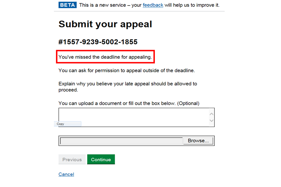 If you submit your appeal more than 14 days after receiving the Home Office decision letter (or 28 days if you are appealing from outside the UK) you will see a message saying that you have missed the deadline.