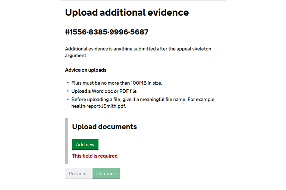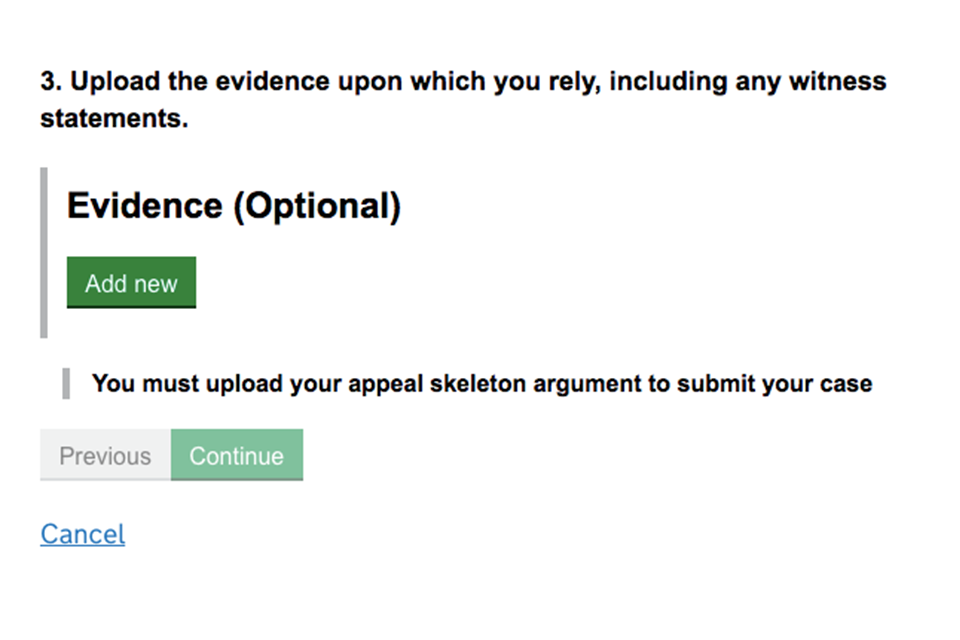Next, you must upload your evidence, including any witness statements. You can upload this as one document, so long as it’s paginated, or as separate documents. Select ‘Continue’.