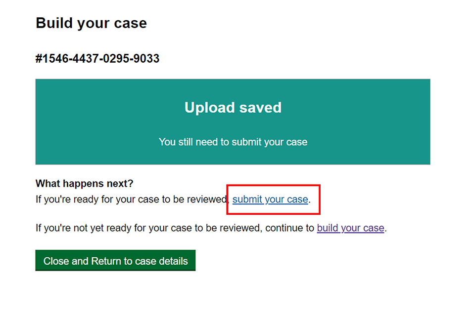 If you are ready to submit, select ‘submit your case’. Alternatively, select ‘build your case’ to add more evidence.