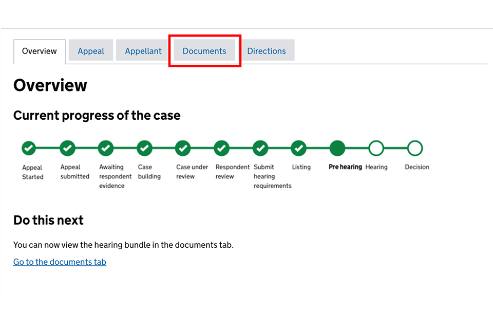 Before the hearing, all documents relating to the hearing will be combined in a ‘digital bundle’. You can view the bundle by selecting the documents tab.