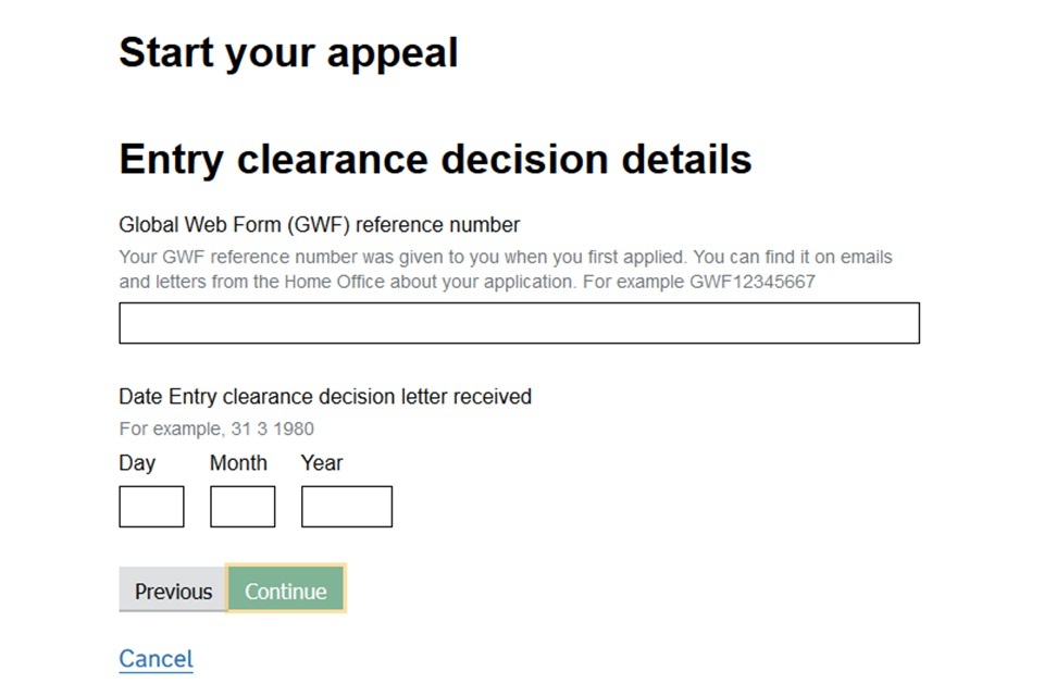 Out of country appellants may be asked to provide the ‘entry clearance decision details’. Find the Global Web Form (GWF) reference number on emails and letters from the Home Office to your client about the appeal.
