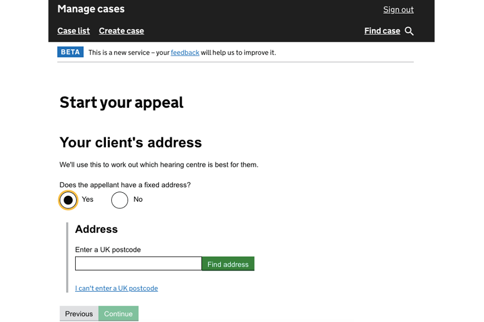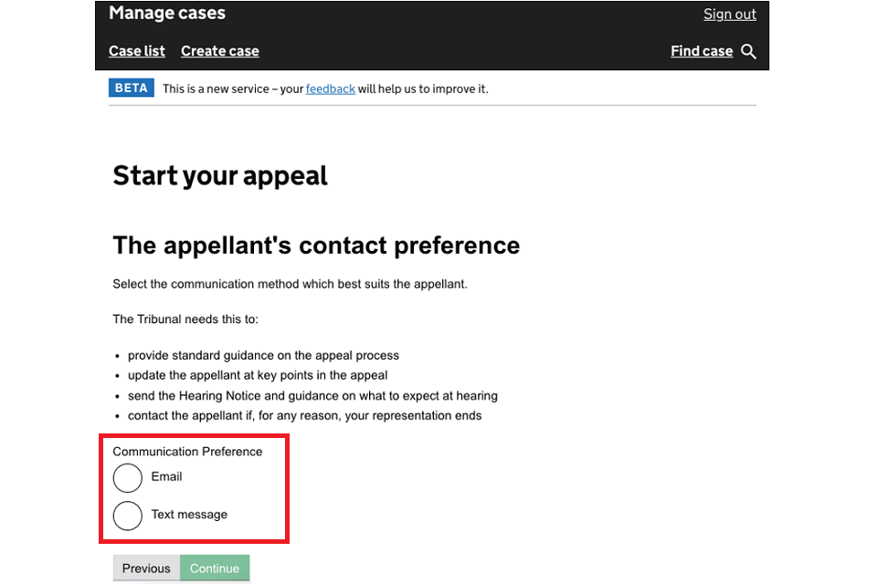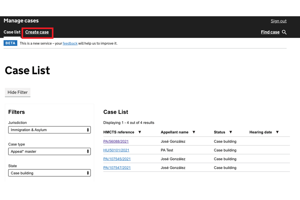 Once you have signed in to MyHMCTS, you will see your case list – this will be empty the first time you sign in. Start an appeal by selecting ‘Create case’.