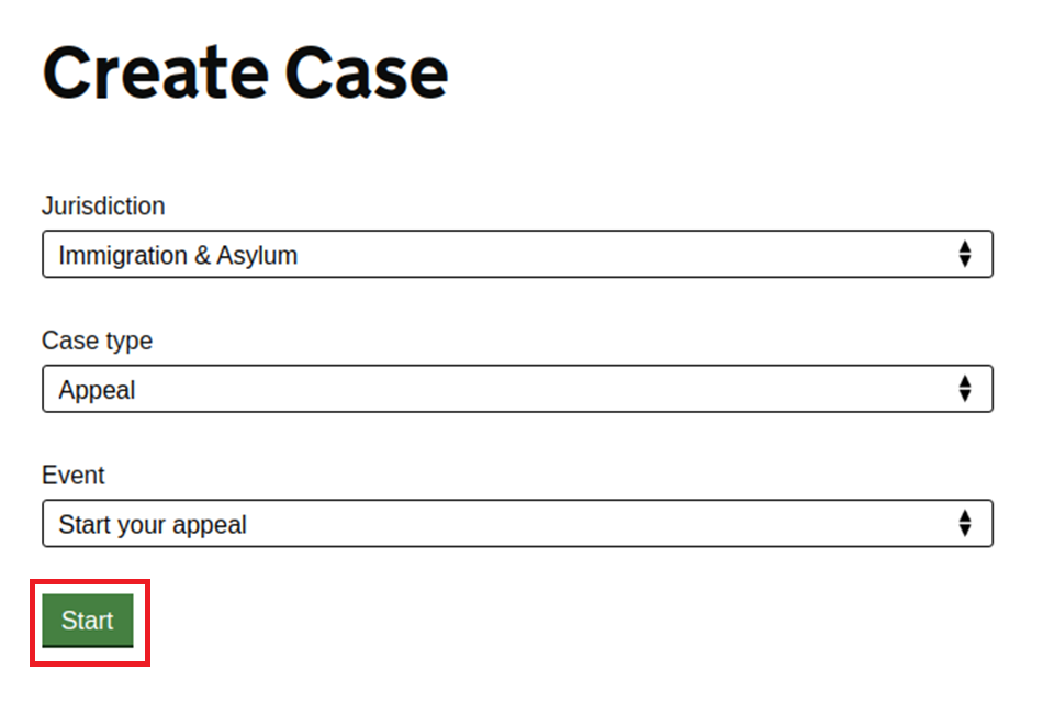 Use the drop-down boxes to select the jurisdiction (‘Immigration and Asylum’), case type (‘Appeal’) and event (‘Start your appeal’). Once all are selected, select ‘Start’.