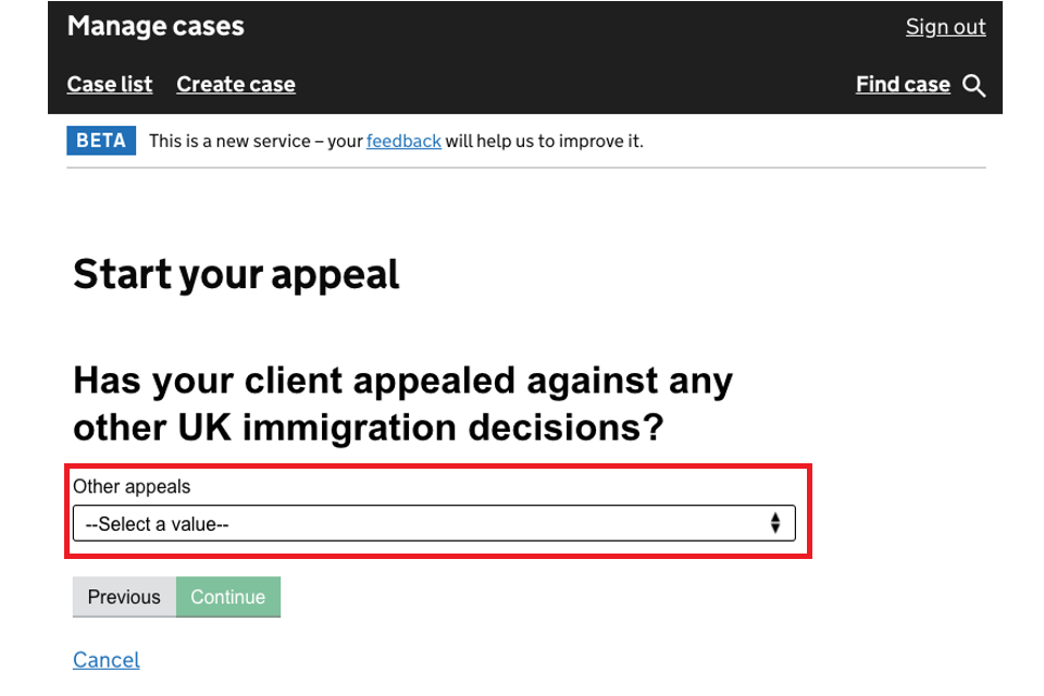 Tell us if your client has appealed against any other immigration decisions using the drop-down menu.