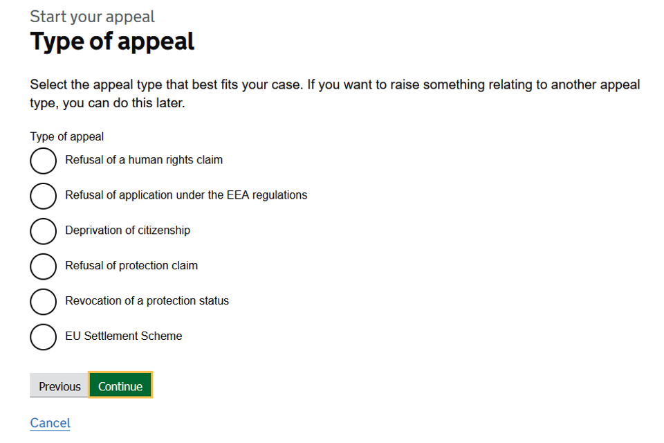 Select the type of appeal that best fits your case. If you want to raise something relating to another appeal type, you can do this later.