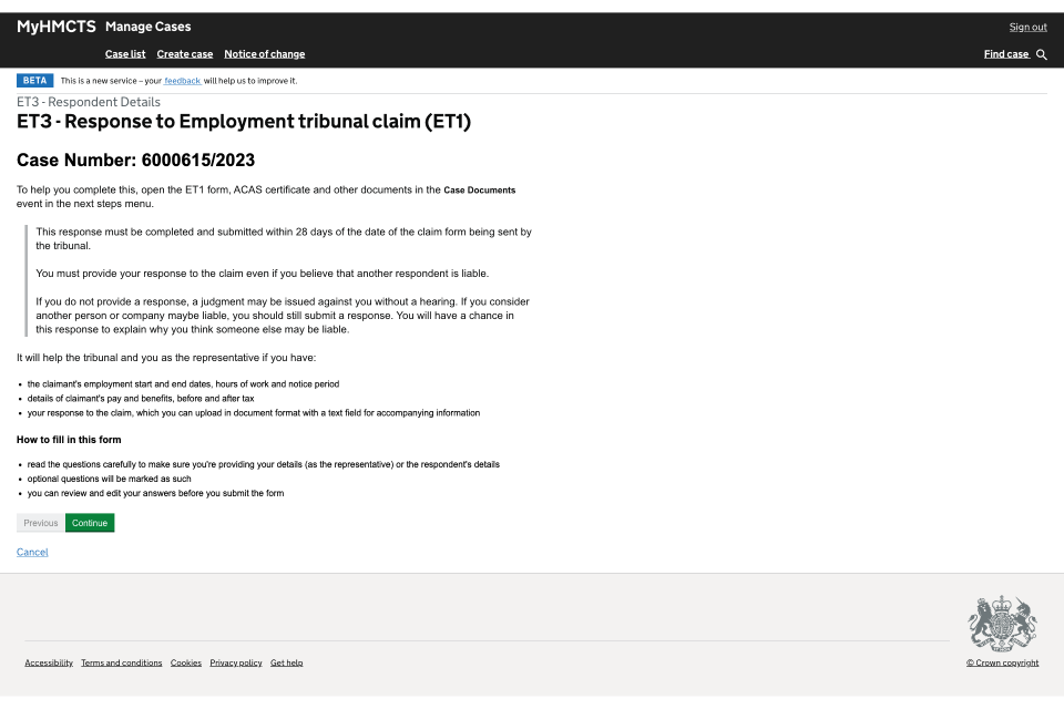5. You will then be asked to confirm the claimant’s name, as well as the respondent details and their contact and hearing format preferences. Once you have completed each screen select ‘Continue’.